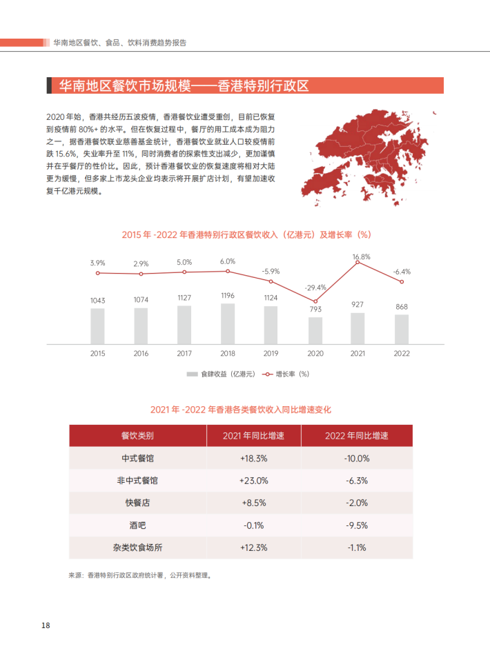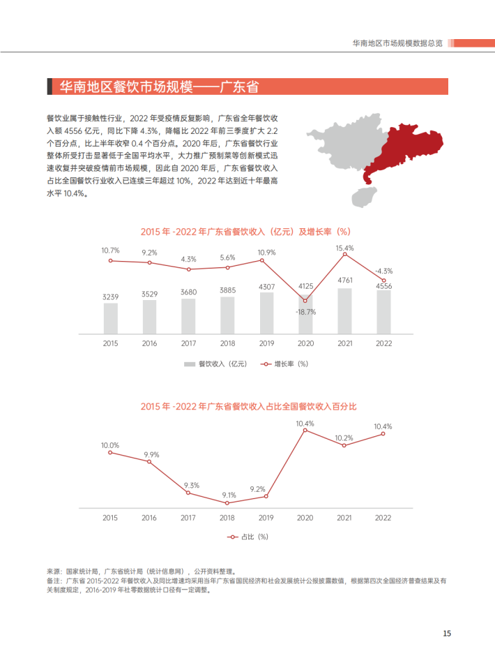 餐饮业属于接触性行业,2022年受疫情反复影响,广东省全年餐饮收入额4556亿元,同比下降4.3%,降幅比2022年前三季度扩大2.2个百分点,比上半年收窄0.4个百分点。2020年后,广东省餐饮行业整体所受打击显著低于全国平均水平,大力推广预制菜等创新模式迅速收复并突破疫情前市场规模,因此自2020年后,广东省餐饮收入占比全国餐饮行业收入已连续三年超过10%,2022年达到近十年最高水平10.4%。
