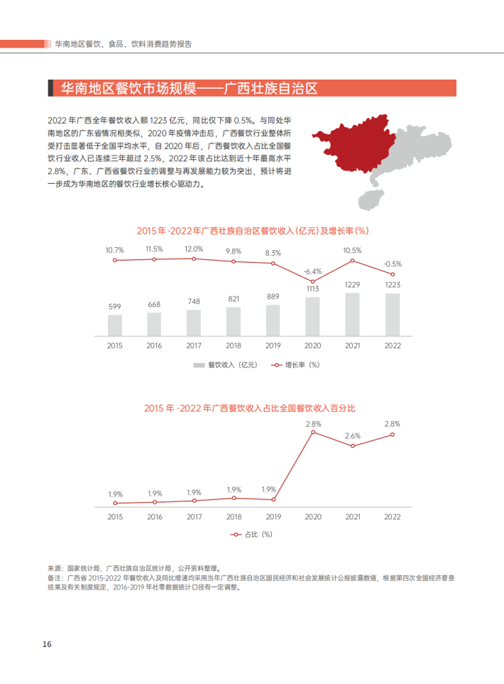 2022年广西全年餐饮收入额1223亿元,同比仅下降0.5%。与同处华南地区的广东省情况相类似,2020年疫情冲击后,广西餐饮行业整体所受打击显著低于全国平均水平,自2020年后,广西餐饮收入占比全国餐饮行业收入已连续三年超过2.5%,2022年该占比达到近十年最高水平2.8%,广东、广西省餐饮行业的调整与再发展能力较为突出,预计将进一步成为华南地区的餐饮行业增长核心驱动力。