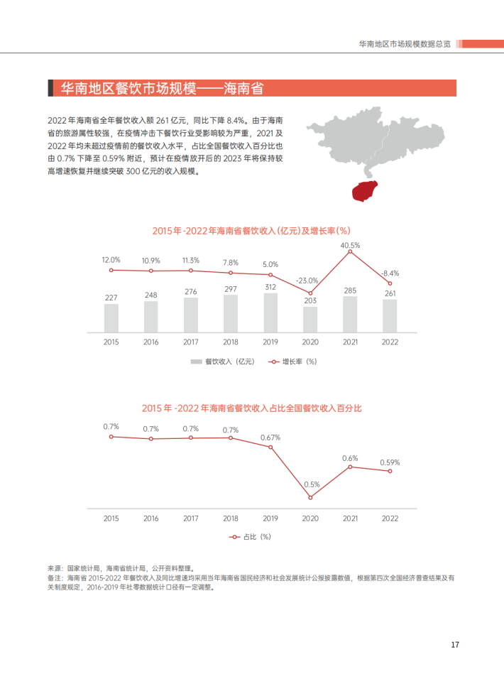 2022年海南省全年餐饮收入额261亿元,同比下降8.4%。由于海南省的旅游属性较强,在疫情冲击下餐饮行业受影响较为严重,2021及2022年均未超过疫情前的餐饮收入水平,占比全国餐饮收入百分比也由0.7%下降至0.59%附近,预计在疫情放开后的2023年将保持较高增速恢复并继续突破300亿元的收入规模。