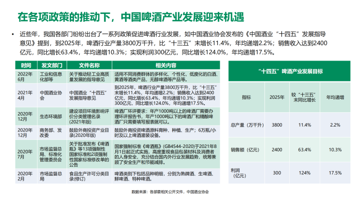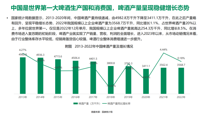 作为水和茶之后世界上消耗量排名第三的饮料,啤酒在当下展现出了巨大的消费潜力。中国的啤酒总产量和消费量已位居世界第一,啤酒产业受到了各级政府的高度重视和国家产业政策的重点支持,总体呈现出创新能力不断提高、质量安全健康有序的良好发展态势。