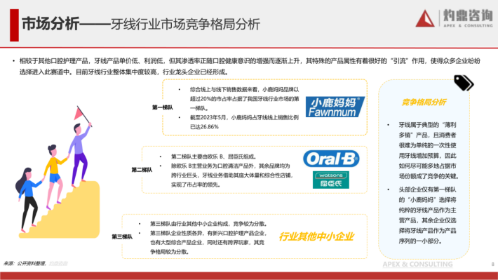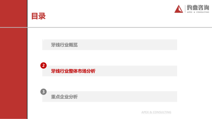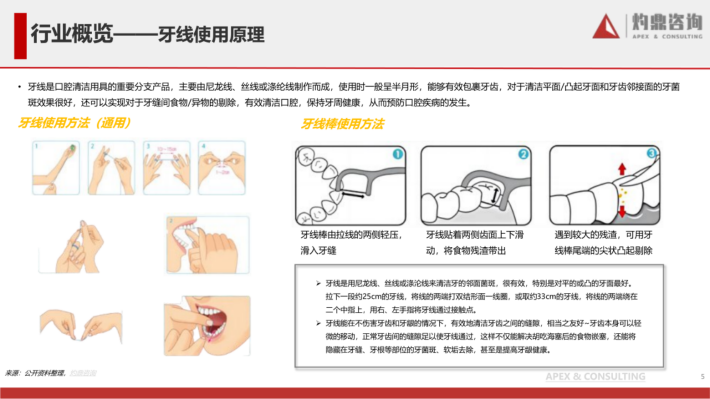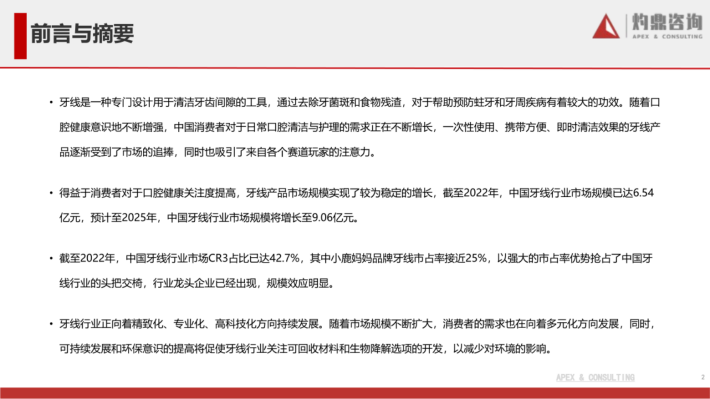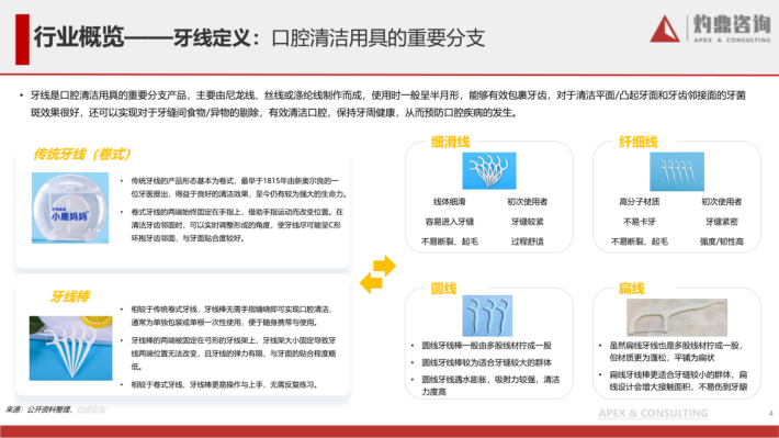 牙线是一种专门设计用于清洁牙齿间隙的工具,通过去除牙菌斑和食物残渣,对于帮助预防蛀牙和牙周疾病有着较大的功效。随着口腔健康意识地不断增强,中国消费者对于日常口腔清洁与护理的需求正在不断增长,一次性使用、携带方便、即时清洁效果的牙线产品逐渐受到了市场的追捧,同时也吸引了来自各个赛道玩家的注意力。