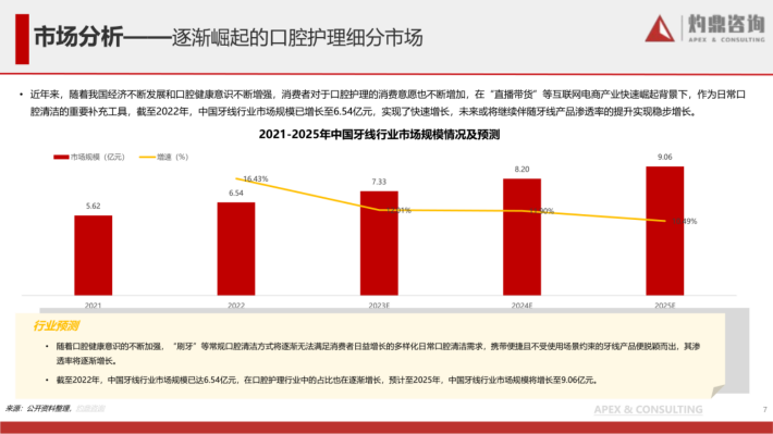 得益于消费者对于口腔健康关注度提高,牙线产品市场规模实现了较为稳定的增长,截至2022年,中国牙线行业市场规模已达6.54亿元,预计至2025年,中国牙线行业市场规模将增长至9.06亿元。
