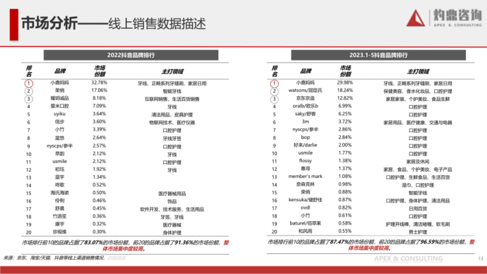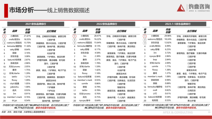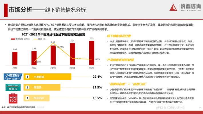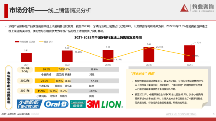 截至2022年,中国牙线行业市场CR3占比已达42.7%,其中小鹿妈妈品牌牙线市占率接近25%,以强大的市占率优势抢占了中国牙线行业的头把交椅,行业龙头企业已经出现,规模效应明显。