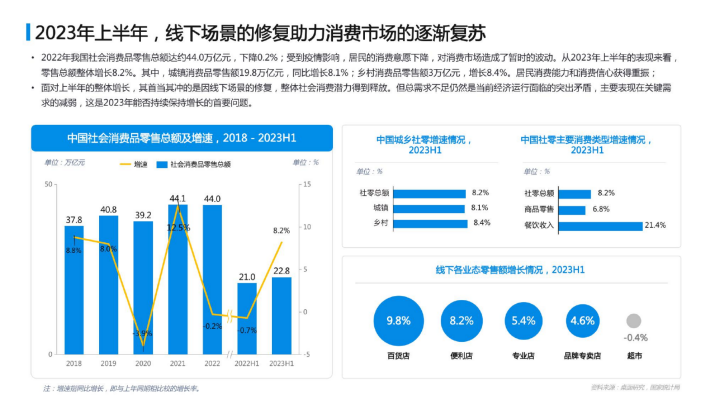 面对上半年的整体增长,其首当其冲的是因线下场景的修复,整体社会消费潜力得到释放。但总需求不足仍然是当前经济运行面临的突出矛盾,主要表现在关键需求的减弱,这是2023年能否持续保持增长的首要问题。
