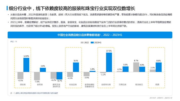 2023上半年,随着疫情解封,线下实体经济复苏,服装、金银珠宝、化妆品这些较依赖线下实体门店的行业获得修复式的增长;酒类行业在上半年平稳释放疫情期间积压的库存,也获得了超过8%的增幅。受到上游房地产行业的影响,建筑及装潢材料类行业在上半年同比持续下跌。