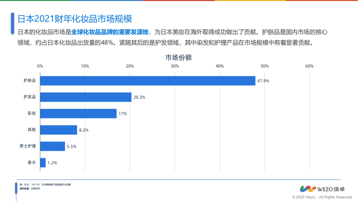 日本的化妆品市场是全球化妆品品牌的重要发源地,为日本美妆在海外取得成功做出了贡献。护肤品是国内市场的核心领域,约占日本化妆品出货量的48%。紧随其后的是护发领域,其中染发和护理产品在市场规模中有着显著贡献。