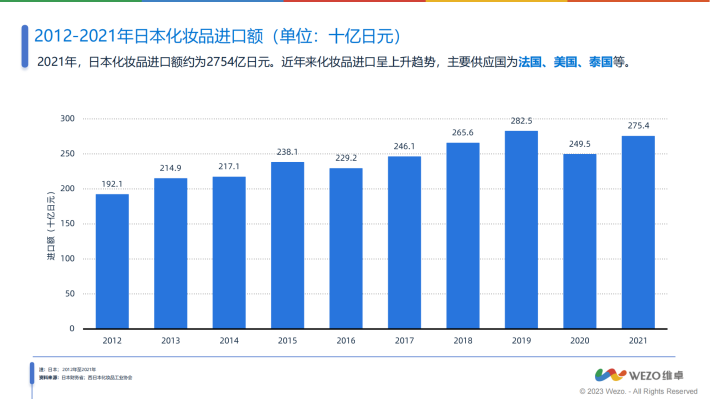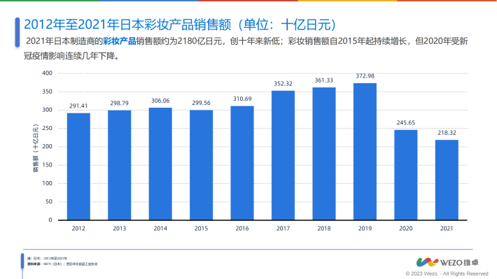 2021年日本制造商的彩妆产品销售额约为2180亿日元,创十年来新低;彩妆销售额自2015年起持续增长,但2020年受新冠疫情影响连续几年下降。