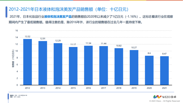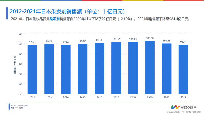 2021年,日本化妆品行业染发剂销售额自2020年以来下降了22亿日元(-2.19%)。2021年销售额下降至984.4亿日元。