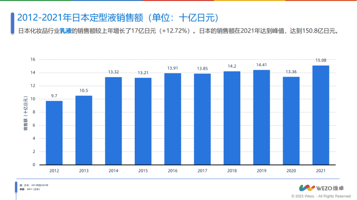 日本化妆品行业乳液的销售额较上年增长了17亿日元(+12.72%)。日本的销售额在2021年达到峰值,达到150.8亿日元。