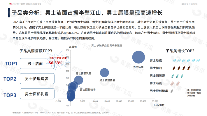2023年1-6月男士护肤子品类销售额TOP3分别为男士洁面、男士护理套装以及男士面部乳霜,其中男士洁面的销售额占整个男士护肤品类的56.33%,占据了男士护肤超过一半的比例,在此数据下这三大子品类的竞争也是略显激烈;男士唇膜以及男士润唇膏呈现猛烈的增长趋势,尤其是男士唇膜品类环比增长高达8500.62%,这表明男士越来越注重自己的唇部状态,除此之外男士精油、男士颈膜以及男士眼部精华也呈现高速的增长趋势,男士也开始提高对抗老的重视程度。