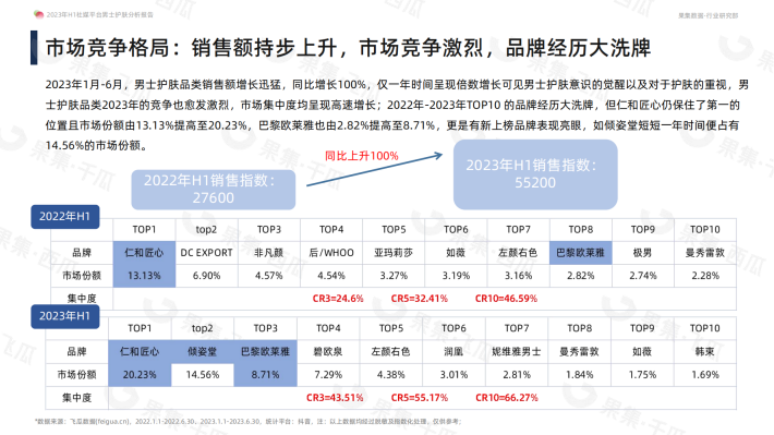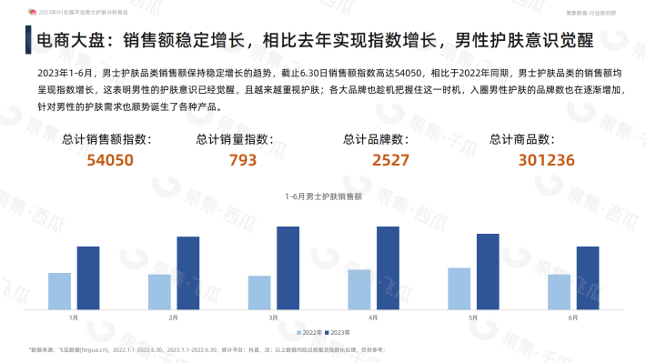 2023年1-6月,男士护肤品类销售额保持稳定增长的趋势,截止6.30日销售额指数高达54050,相比于2022年同期,男士护肤品类的销售额均呈现指数增长,这表明男性的护肤意识已经觉醒,且越来越重视护肤;各大品牌也趁机把握住这一时机,入圈男性护肤的品牌数也在逐渐增加,针对男性的护肤需求也顺势诞生了各种产品。