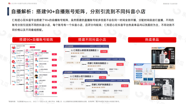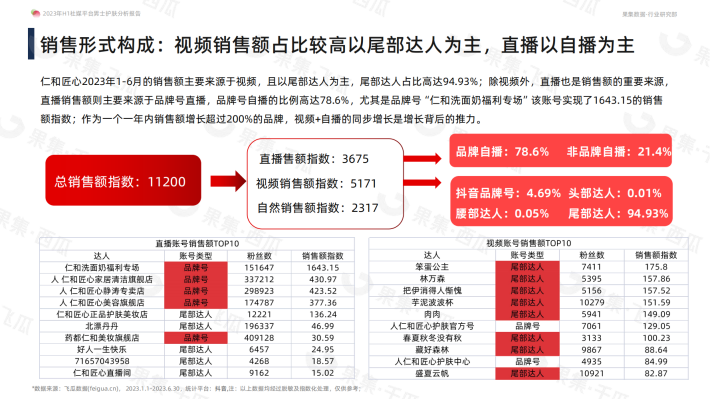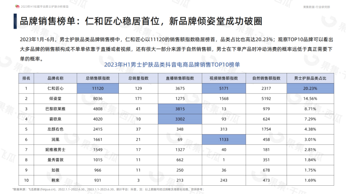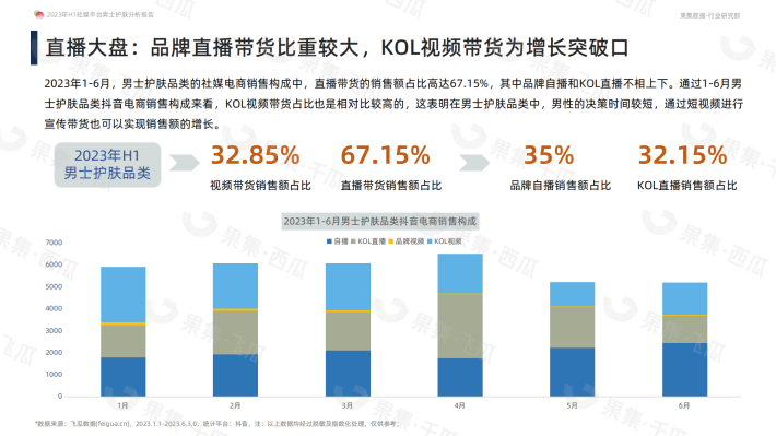 2023年1-6月,男士护肤品类的社媒电商销售构成中,直播带货的销售额占比高达67.15%,其中品牌自播和KOL直播不相上下。通过1-6月男士护肤品类抖音电商销售构成来看,KOL视频带货占比也是相对比较高的,这表明在男士护肤品类中,男性的决策时间较短,通过短视频进行宣传带货也可以实现销售额的增长。