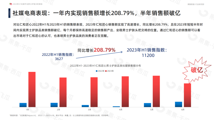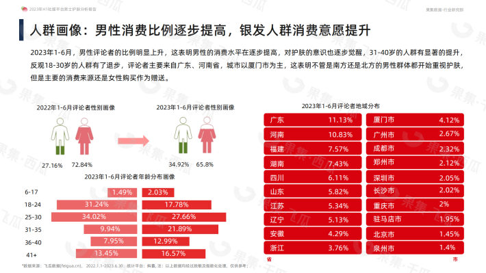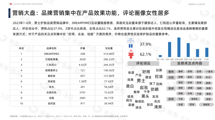 2023年1-6月,男士护肤品类营销品牌中,DREAMTIMES互动量稳居榜首,其相关互动量来源于腰部达人,仁和匠心声量较高,主要铺设尾部达人;评论词云中,男性占比37.9%,Z世代占比较高,女性占比62.1%,虽然男性自主意识在逐步提升但是女性赠送也是该品类销售额的重要来源方式;对于产品的关注点则集中在“好用、去油、祛痘”方面的需求,价格也是男性在选择护肤品的重要参考。
