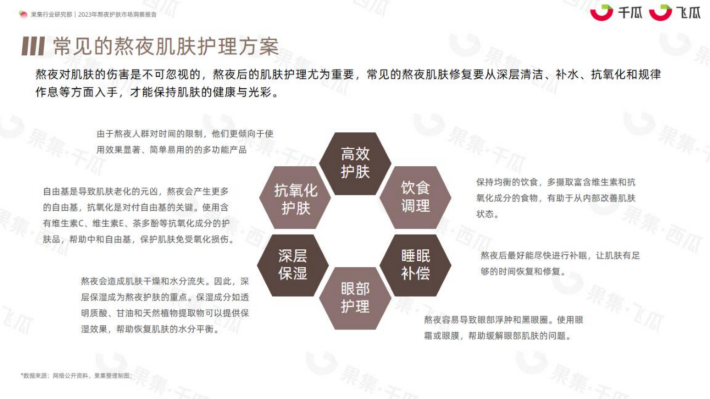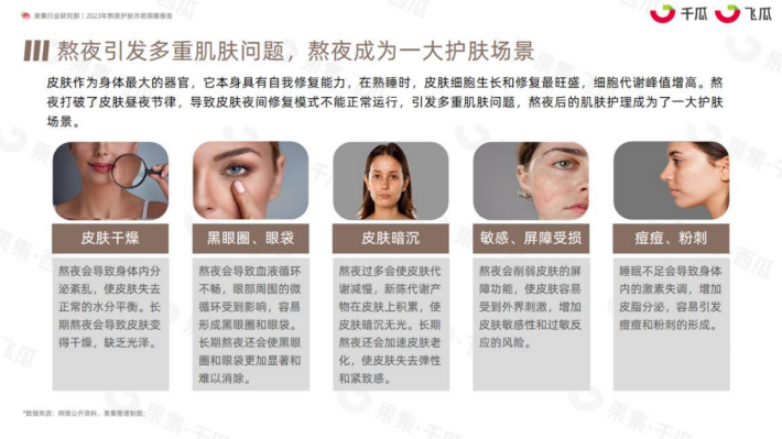 皮肤作为身体最大的器官,它本身具有自我修复能力,在熟睡时,皮肤细胞生长和修复最旺盛,细胞代谢峰值增高。熬夜打破了皮肤昼夜节律,导致皮肤夜间修复模式不能正常运行,引发多重肌肤问题,熬夜后的肌肤护理成为了一大护肤场景。
