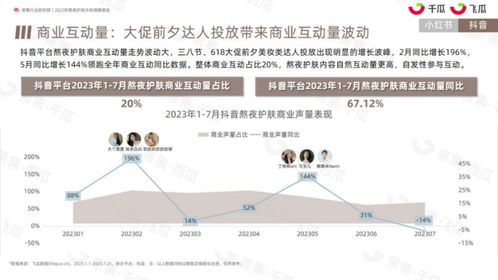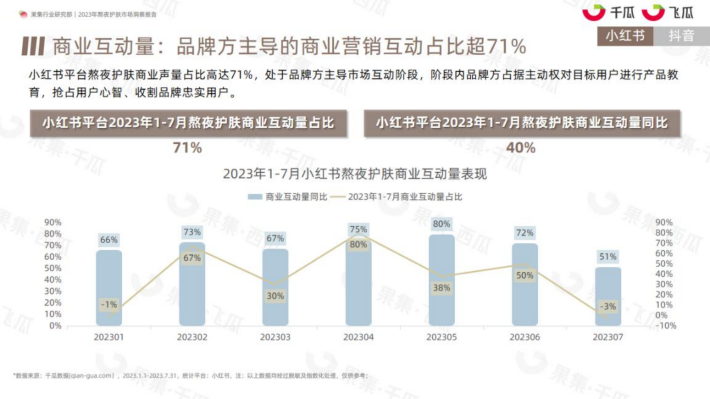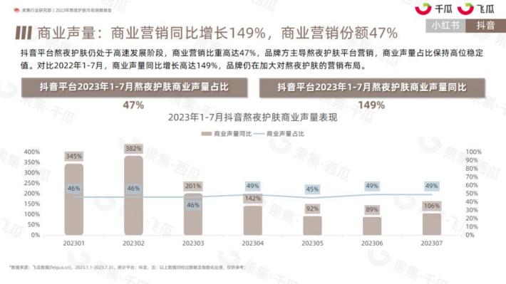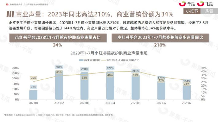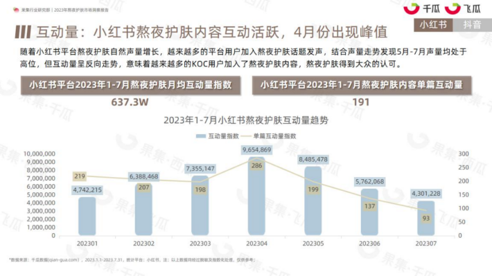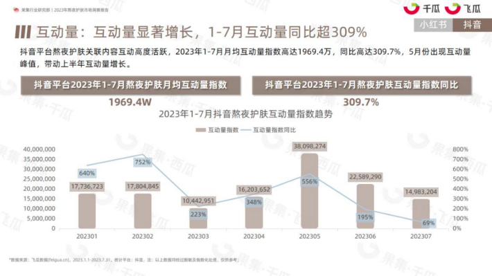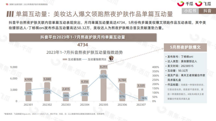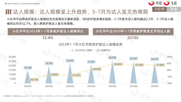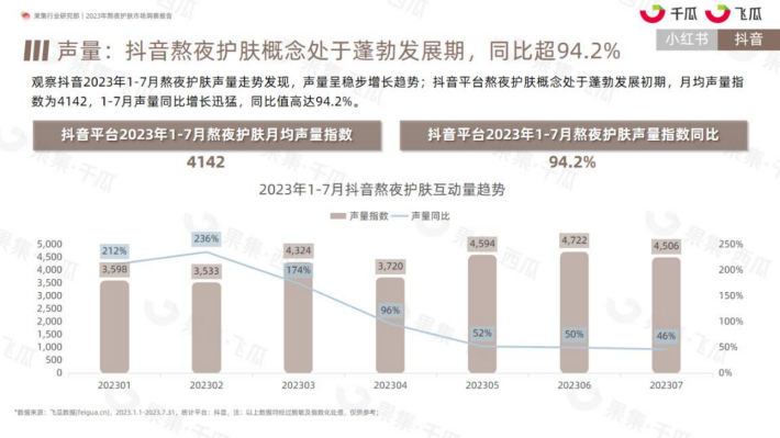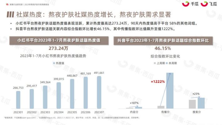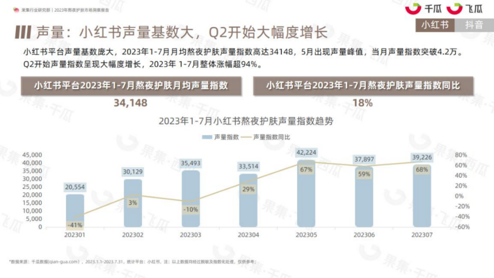 小红书平台声量基数庞大,2023年1-7月月均熬夜护肤声量指数高达34148,5月出现声量峰值,当月声量指数突破4.2万。Q2开始声量指数呈现大幅度增长,2023年1-7月整体涨幅超94%。