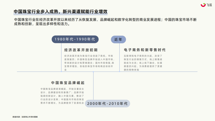 中国珠宝行业在经济改革开放以来经历了从恢复发展、品牌崛起和数字化转型的商业发展进程;中国的珠宝市场不断成熟和创新,呈现出多样性和活力。