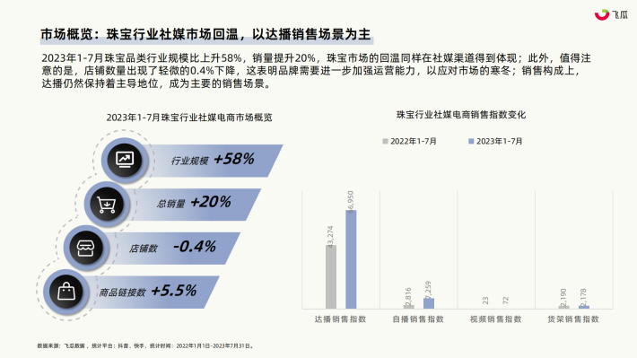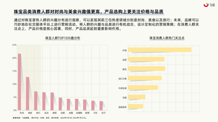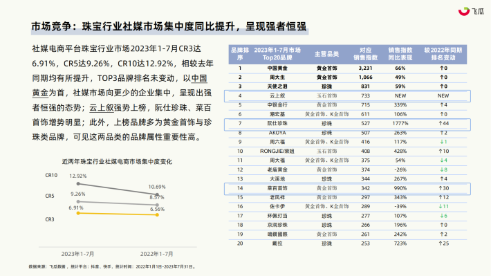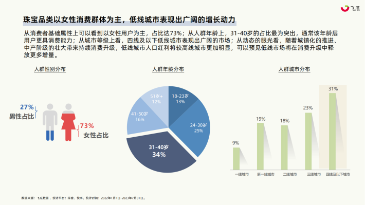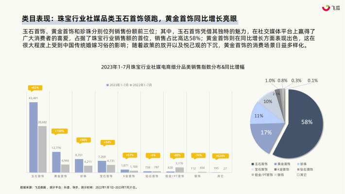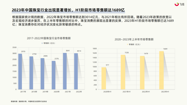 根据国家统计局的数据,2022年珠宝市场零售额达到3014亿元,与2021年相比有所回调。随着2023年政策的放宽以及宏观经济逐步复苏,在上半年零售额的对比中,珠宝消费的展现出显著的反弹,2023年H1阶段市场零售额已达1689亿;珠宝消费存在对经济状况变化异常敏感的特点。