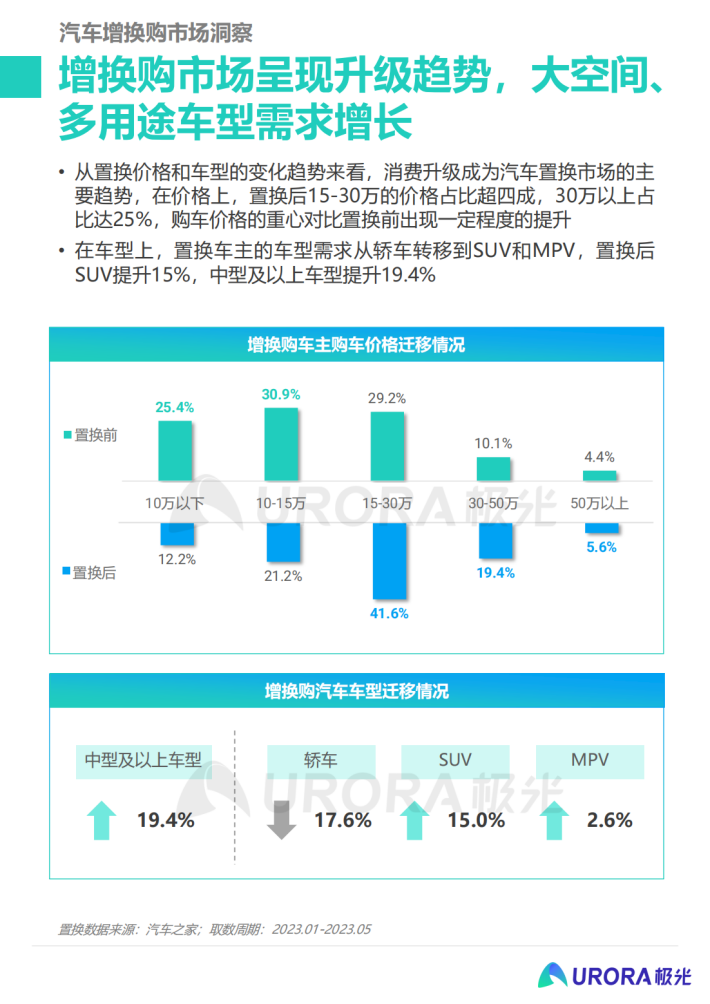 在车型上,置换车主的车型需求从轿车转移到SUV和MPV,置换后SUV提升15%,中型及以上车型提升19.4%