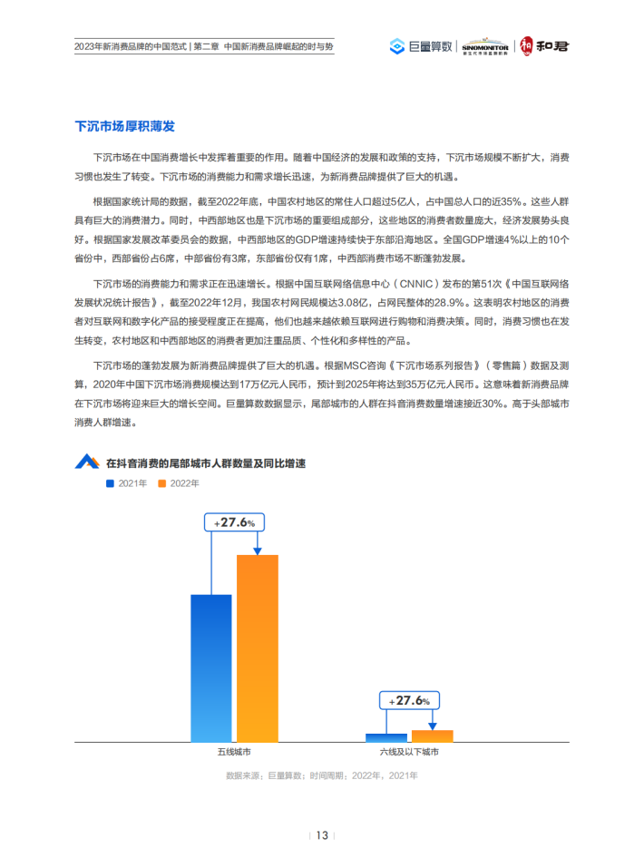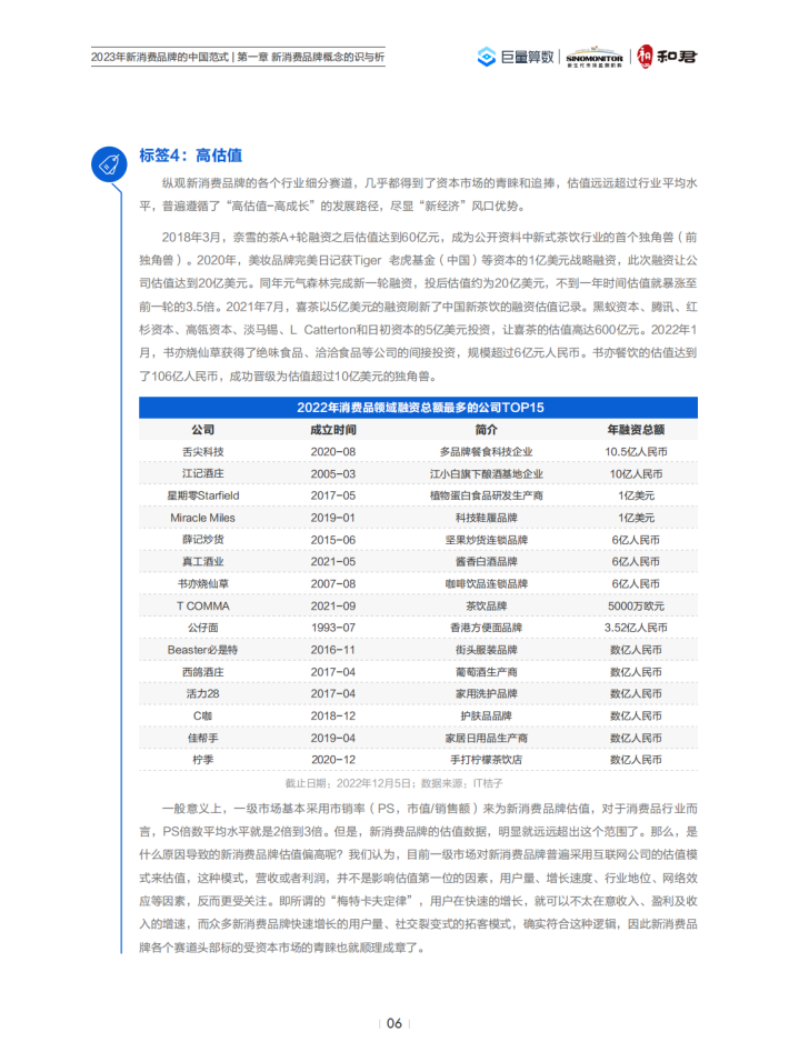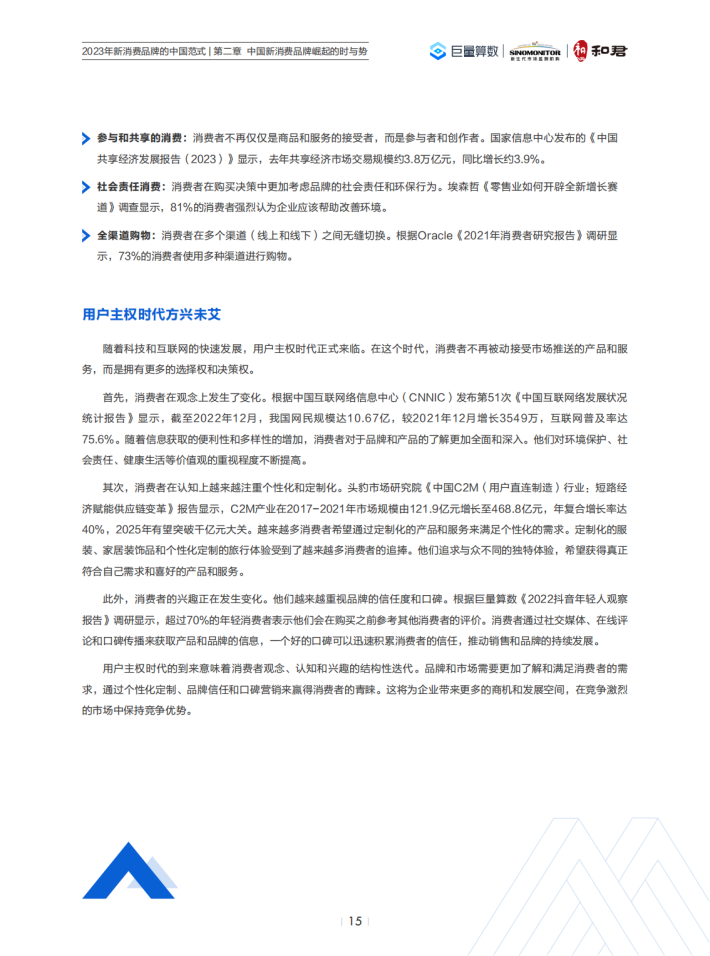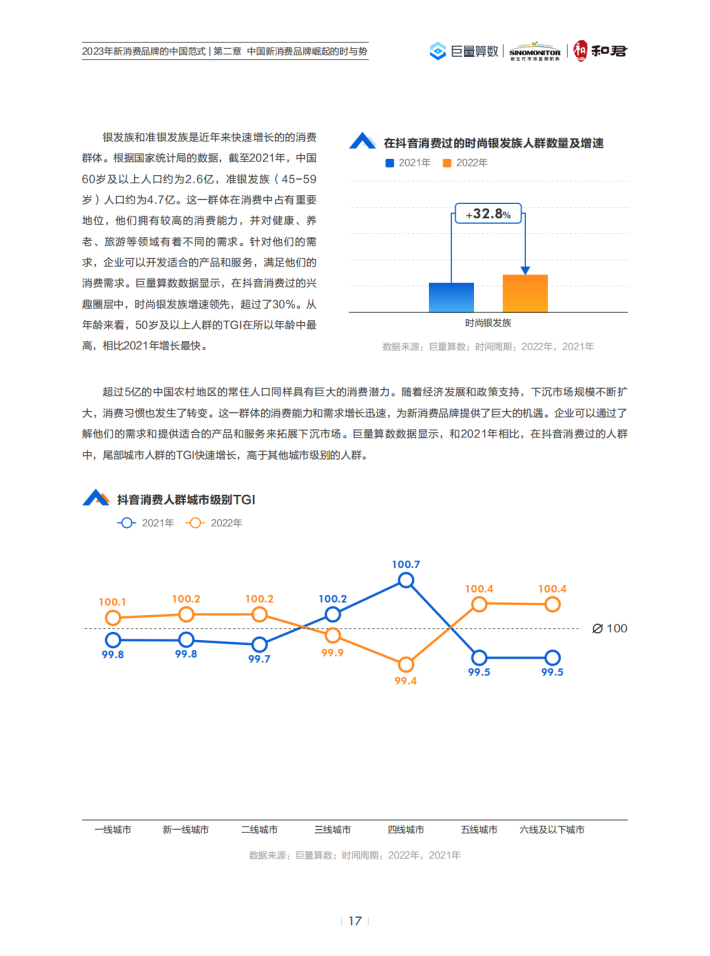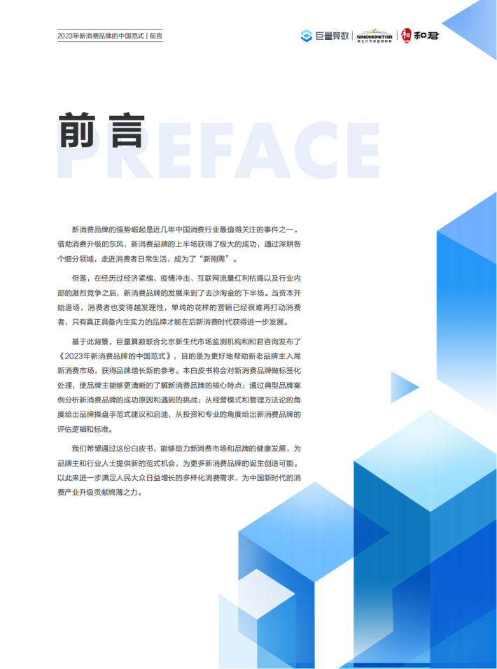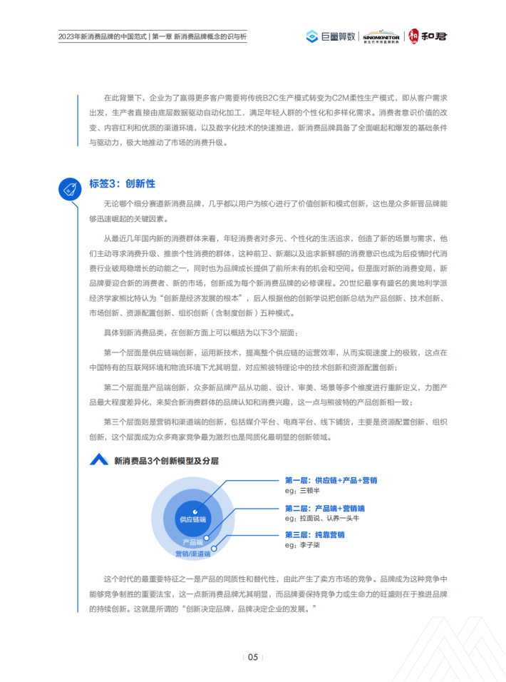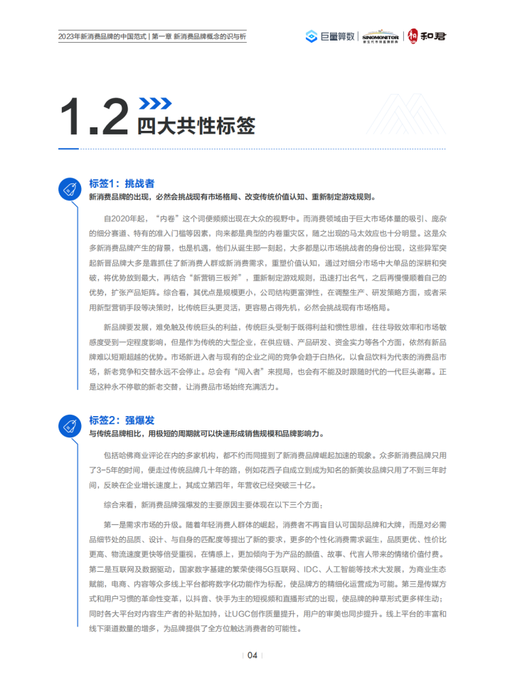 基于此背景,巨量算数联合北京新生代市场监测机构和和君咨询发布了《2023年新消费品牌的中国范式》,目的是为更好地帮助新老品牌主入局新消费市场,获得品牌增长新的参考。本白皮书将会对新消费品牌做标签化处理,使品牌主能够更清晰的了解新消费品牌的核心特点;通过典型品牌案例分析新消费品牌的成功原因和遇到的挑战;从经营模式和管理方法论的角度给出品牌操盘手范式建议和启迪,从投资和专业的角度给出新消费品牌的评估逻辑和标准。