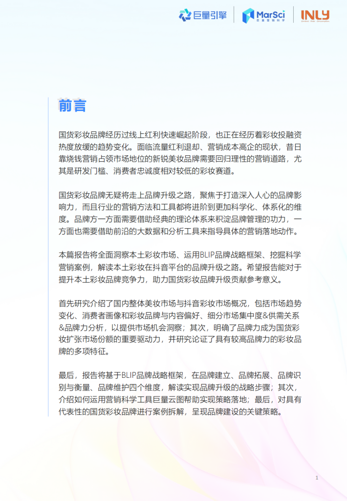 本篇报告将全面洞察本土彩妆市场、运用BLIP品牌战略框架、挖掘科学营销案例,解读本土彩妆在抖音平台的品牌升级之路。希望报告能对于提升本土彩妆品牌竞争力,助力国货彩妆品牌升级贡献参考意义。