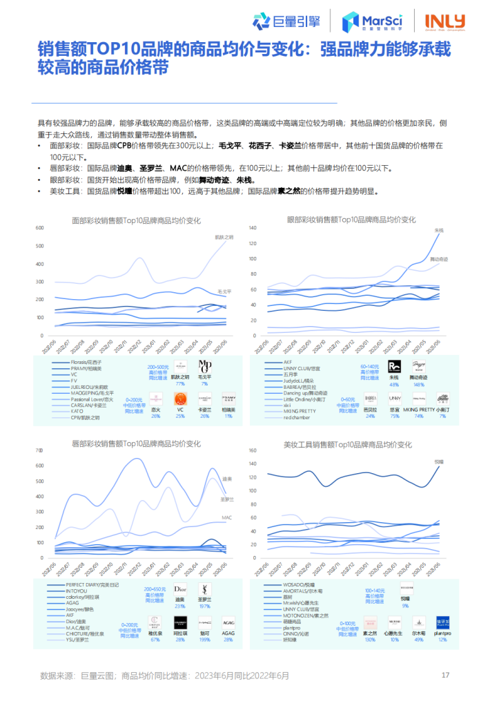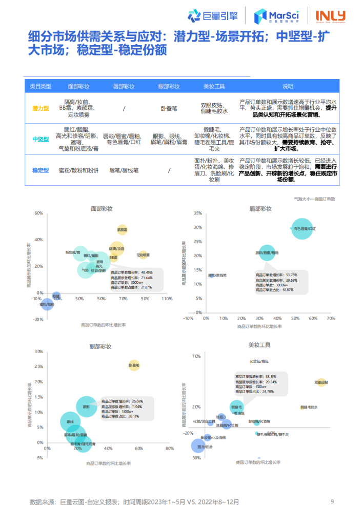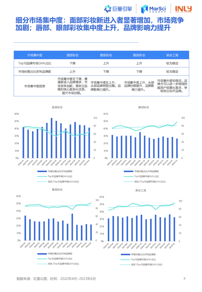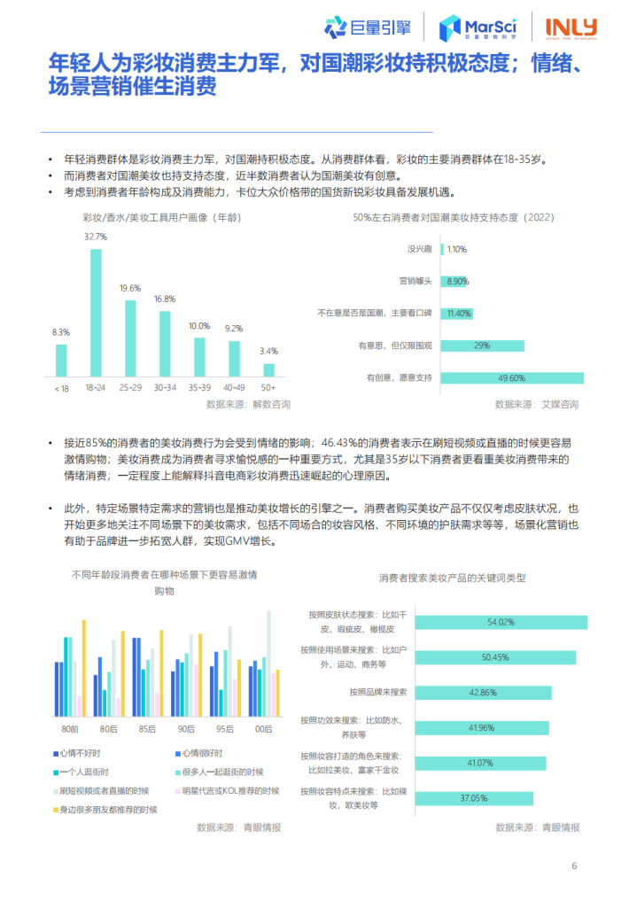 首先研究介绍了国内整体美妆市场与抖音彩妆市场概况,包括市场趋势变化、消费者画像和彩妆品牌与内容偏好、细分市场集中度&供需关系&品牌力分析,以提供市场机会洞察;其次,明确了品牌力成为国货彩妆扩张市场份额的重要驱动力,并研究论证了具有较高品牌力的彩妆品牌的多项特征。