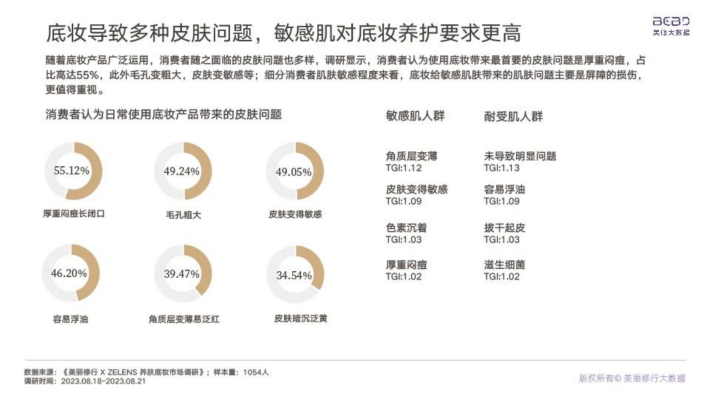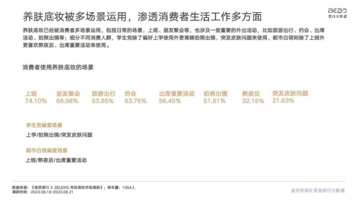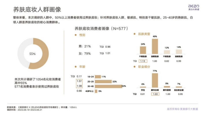 整体来看,本次调研的人群中,50%以上消费者使用过养肤底妆;针对养肤底妆人群,敏感肌,特别是干敏肌肤,25-40岁的熟龄肌,白领人群是养肤底妆的核心消费群体。