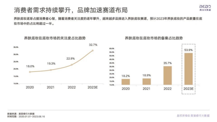 养肤底妆逐渐占据消费者心智,随着消费者关注度的逐年攀升,越来越多品牌进入养肤底妆赛道,预计2023年养肤底妆的产品数量在底妆市场中的占比将超过一半。