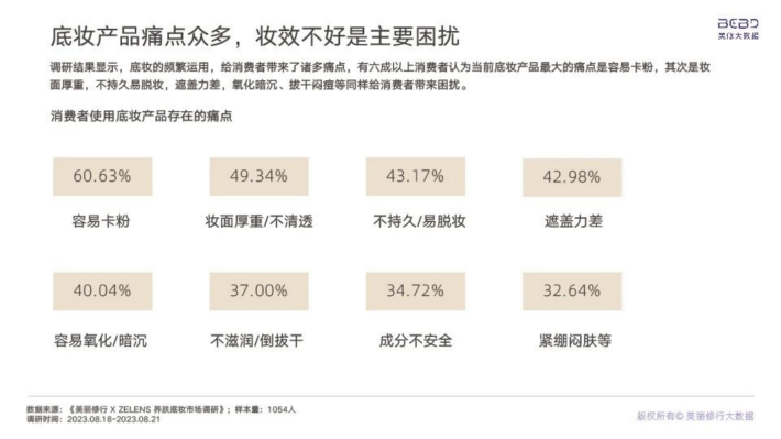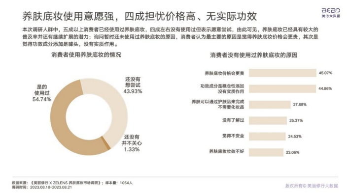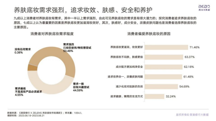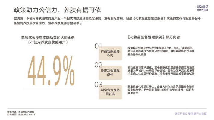 据调研,不使用养肤底妆的用户近一半担忧功效成分是概念添加,没有实际作用,但是《化妆品监督管理条例》政策的发布与实施将会不断加码养肤底妆公信力,宣称养肤变得有据可依。
