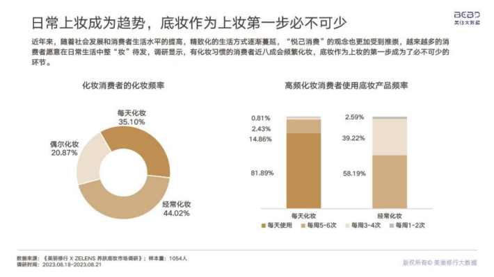 近年来,随着社会发展和消费者生活水平的提高,精致化的生活方式逐渐蔓延,“悦己消费”的观念也更加受到推崇,越来越多的消费者愿意在日常生活中整“妆”待发,调研显示,有化妆习惯的消费者近八成会频繁化妆,底妆作为上妆的第一步成为了必不可少的环节。