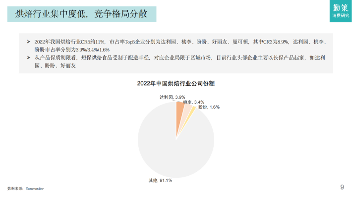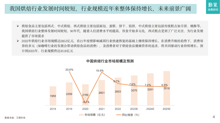 2022年烘焙行业市场规模达2853亿元,在21年疫情影响减弱行业快速恢复的基础上继续保持增长。在消费升级的趋势下,消费场景的多元(如咖啡行业的发展会带动烘焙食品的消费),及消费者对于烘焙食品健康营养的追求,将共同驱动行业持续增长。预计到2025年,行业规模将达3518亿元