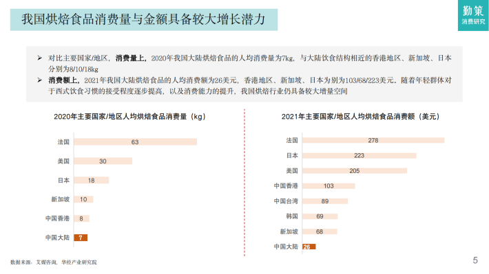 对比主要国家/地区,消费量上,2020年我国大陆烘焙食品的人均消费量为7kg,与大陆饮食结构相近的香港地区、新加坡、日本分别为8/10/18kg