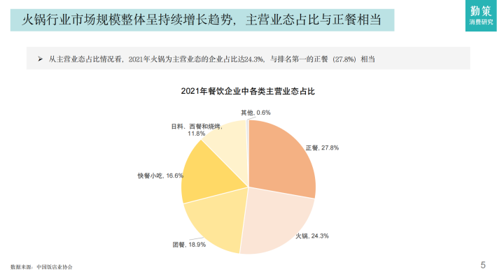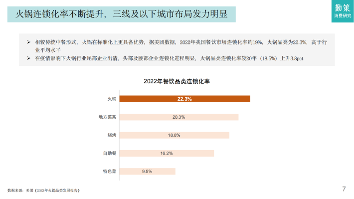 相较传统中餐形式,火锅在标准化上更具备优势,据美团数据,2022年我国餐饮市场连锁化率约19%,火锅品类为22.3%,高于行业平均水平
