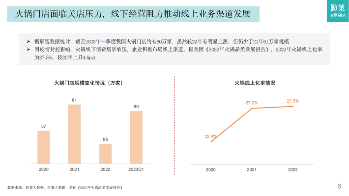因疫情封控影响,火锅线下消费场景承压,企业积极布局线上渠道。据美团《2022年火锅品类发展报告》,2022年火锅线上化率为27.5%,较20年上升4.6pct