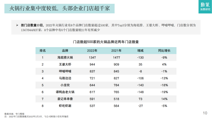 在疫情影响下火锅行业尾部企业出清,头部及腰部企业连锁化进程明显,火锅品类连锁化率较20年(18.5%)上升3.8pct