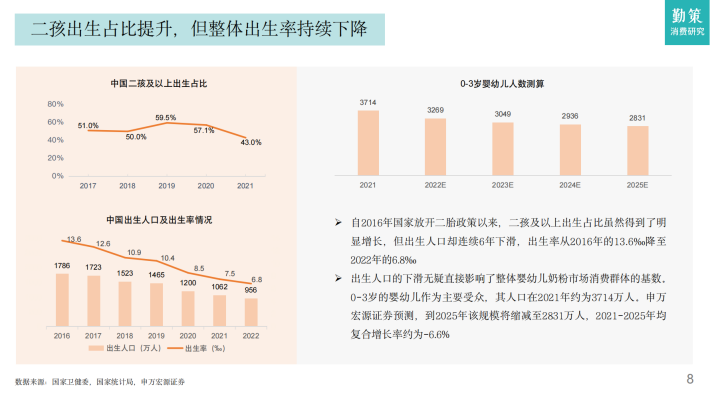 出生人口的下滑无疑直接影响了整体婴幼儿奶粉市场消费群体的基数。0-3岁的婴幼儿作为主要受众,其人口在2021年约为3714万人。申万宏源证券预测,到2025年该规模将缩减至2831万人,2021-2025年均复合增长率约为-6.6%