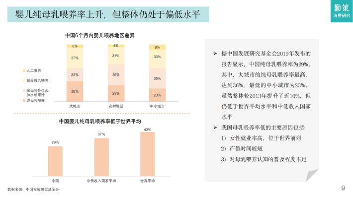 据中国发展研究基金会2019年发布的报告显示,中国纯母乳喂养率为29%。其中,大城市的纯母乳喂养率最高,达到36%,最低的中小城市为23%。虽然整体较2013年提升了近10%,但仍低于世界平均水平和中低收入国家水平