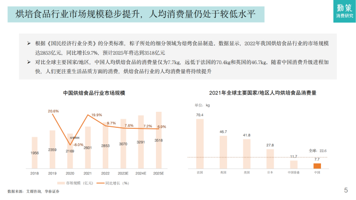 根据《国民经济行业分类》的分类标准,粽子所处的细分领域为焙烤食品制造。数据显示,2022年我国烘焙食品行业的市场规模达2853亿元,同比增长9.7%,预计2025年将达到3518亿元