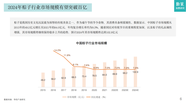 粽子是我国历史文化沉淀最为深厚的传统美食之一,作为端午节的节令食物,其消费具备刚需属性。数据显示,中国粽子市场规模从2015年的49.2亿元增长至2021年的84.0亿元,年均复合增长率约为9.3%。随着国民对传统节日的重视程度加深,以及粽子的礼品属性增强,其市场规模将继续保持稳步上升的趋势,预计2024年其市场规模将达到102.9亿元