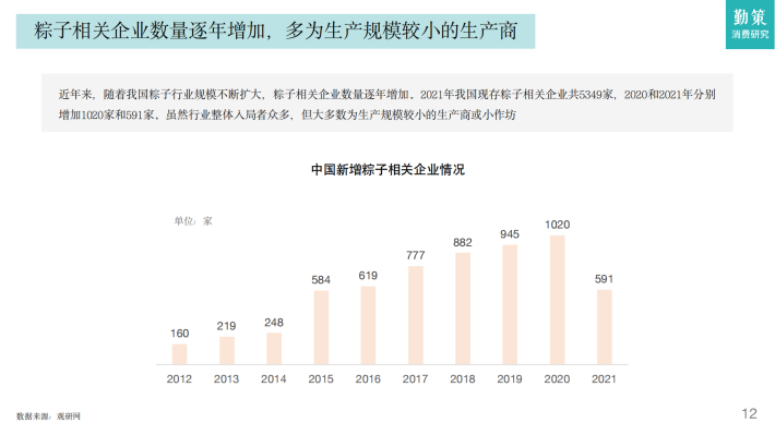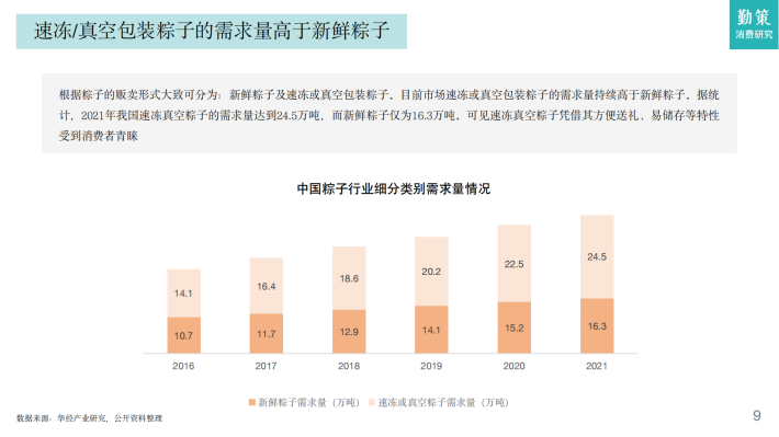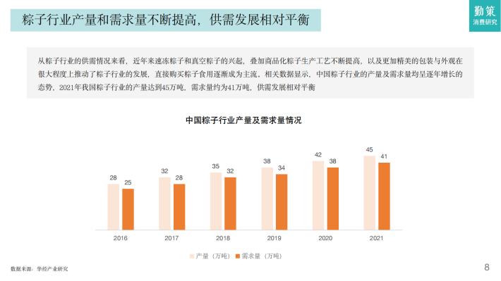 从粽子行业的供需情况来看,近年来速冻粽子和真空粽子的兴起,叠加商品化粽子生产工艺不断提高,以及更加精美的包装与外观在很大程度上推动了粽子行业的发展,直接购买粽子食用逐渐成为主流。相关数据显示,中国粽子行业的产量及需求量均呈逐年增长的态势,2021年我国粽子行业的产量达到45万吨,需求量约为41万吨,供需发展相对平衡