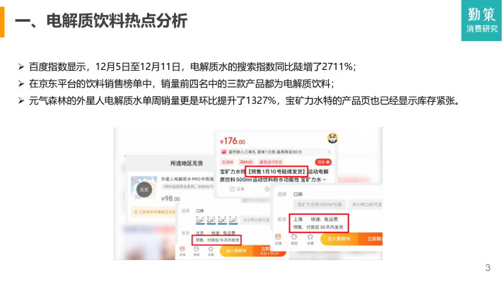 百度指数显示,12月5日至12月11日,电解质水的搜索指数同比陡增了2711%;在京东平台的饮料销售榜单中,销量前四名中的三款产品都为电解质饮料;元气森林的外星人电解质水单周销量更是环比提升了1327%,宝矿力水特的产品页也已经显示库存紧张。