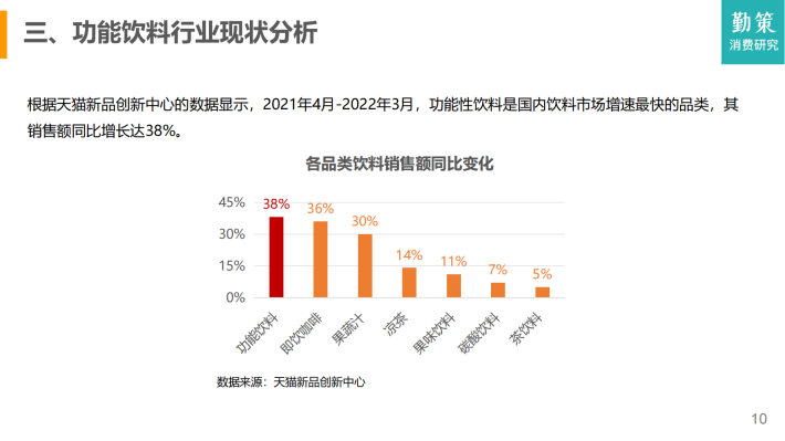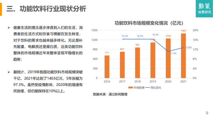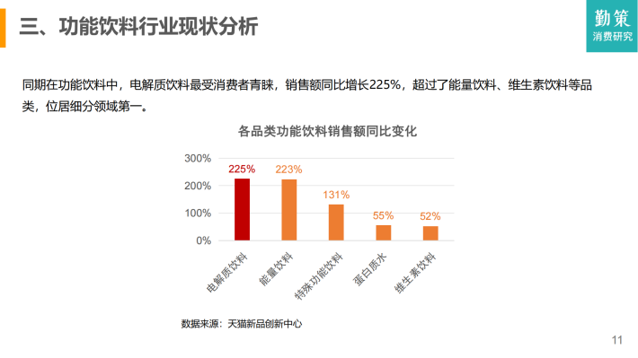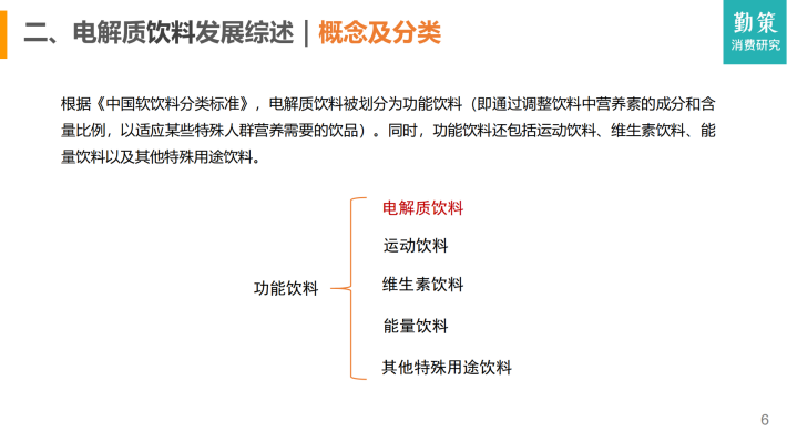 根据《中国软饮料分类标准》,电解质饮料被划分为功能饮料(即通过调整饮料中营养素的成分和含量比例,以适应某些特殊人群营养需要的饮品)。同时,功能饮料还包括运动饮料、维生素饮料、能量饮料以及其他特殊用途饮料。