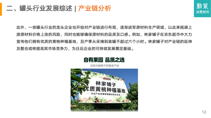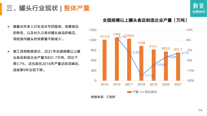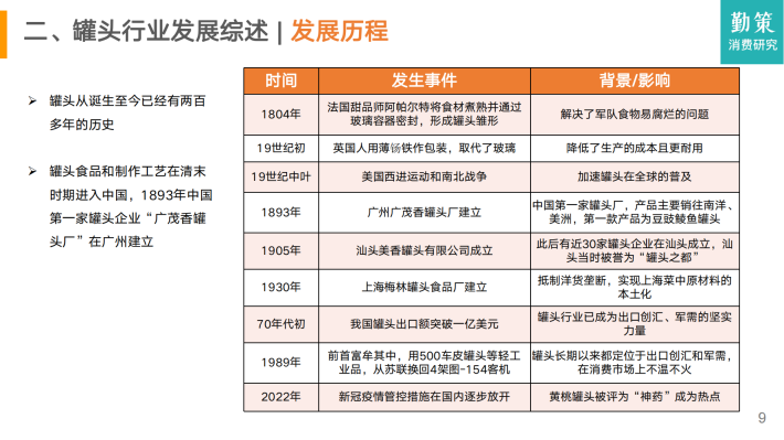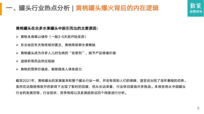 截至2021年,黄桃罐头的发展基本和整个罐头行业一样,并没有受到人们的青睐,甚至还出现了连年萎缩的态势。虽然在近期疫情放开的影响下出现了暂时的回暖,但从长远来看,行业依旧面临许多挑战。本报告将从中国罐头行业的发展历程、行业现状、竞争格局以及发展趋势这四个纬度进行分析。