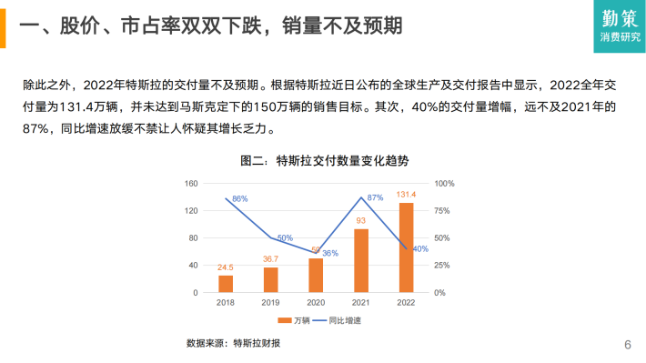 除此之外,2022年特斯拉的交付量不及预期。根据特斯拉近日公布的全球生产及交付报告中显示,2022全年交付量为131.4万辆,并未达到马斯克定下的150万辆的销售目标。其次,40%的交付量增幅,远不及2021年的87%,同比增速放缓不禁让人怀疑其增长乏力。