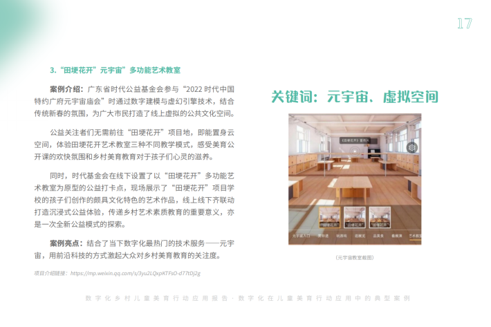 公益背景:伴随着数字技术在公益活动的赋能与体验上的升级,社会公众对公益的认知程度、参与度也不断提升,数字化拉近了公益与社会公众的距离,提升了公益参与形式的趣味性与沉浸式的体验。乡村儿童美育行动积极应用数字化技术,能够增强公众对乡村儿童美育的关注度,使之对乡村儿童美育行动提供更多的帮助,同时也能够使乡村儿童美育所蕴含的内容反哺到关注者身上,扩展乡村儿童美育行动价值影响范围。