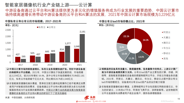 智能家居摄像机细分赛道,简单的互联互通和远程操作已经不能满足消费者用户对智能安防的需求,设备商通过云平台和Al算法提供更为多元化的增值服务将成为行业发展的重要趋势。行业内主要物联网云平台包括萤石网络的萤石云、华为的好望云、小米的loT平台、阿里的飞燕平台、涂鸦智能等。这些物联网云平台直接面向消费者用户或企业客户,提供各类增值服务