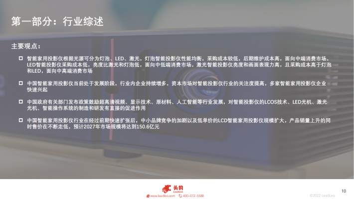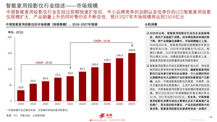 智能家用投影仪的消费市场已经初具规模,2018年2022年销售额的年复合增长率为23.3%,消费市场呈现迅速上升态势。随着行业内企业的增多,中高端智能投影仪的亮度、分辨率、技术方案的差异化程度缩小,行业准入门槛开始降低。因此,中国智能家用投影仪市场规模的增速将会放缓,2022至2027年销售额的年复合增长率预计为14.1%。未来中国智能家用投影仪的增长点在于超高清产品的推广、更先进的软件算法、产品在租房群体中的普及等