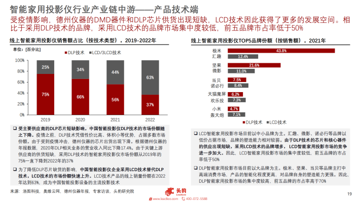 疫情之前,运用DLP技术的智能家用投影仪凭借性价比高、体积小等优势,占据多数市场份额。由于受到疫情冲击,美国德州仪器的DLP芯片短缺,中国智能投影仪DLP技术的市场份额随之下降。根据洛图科技数据,DLP智能家用家用投影仪的市场份额从2019年的75%下降到2022年的37%。为了降低DLP芯片缺货的影响,中国智能投影仪企业采用LCD技术替代DLP技术,LCD技术的市场份额快速上升