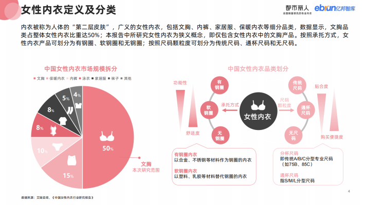 内衣被称为人体的“第二层皮肤”,广义的女性内衣,包括文胸、内裤、家居服、保暖内衣等细分品类,数据显示,文胸品类占整体女性内衣比重达50%;本报告中所研究女性内衣为狭义概念,即仅包含女性内衣中的文胸产品。按照承托方式,女性内衣产品可划分为有钢圈、软钢圈和无钢圈;按照尺码颗粒度可划分为传统尺码、通杯尺码和无尺码。