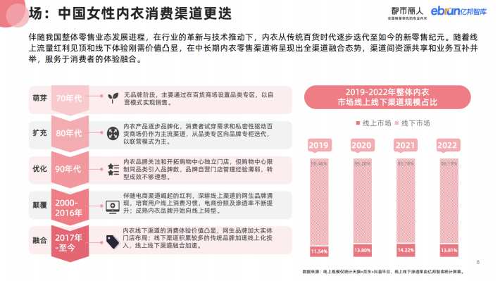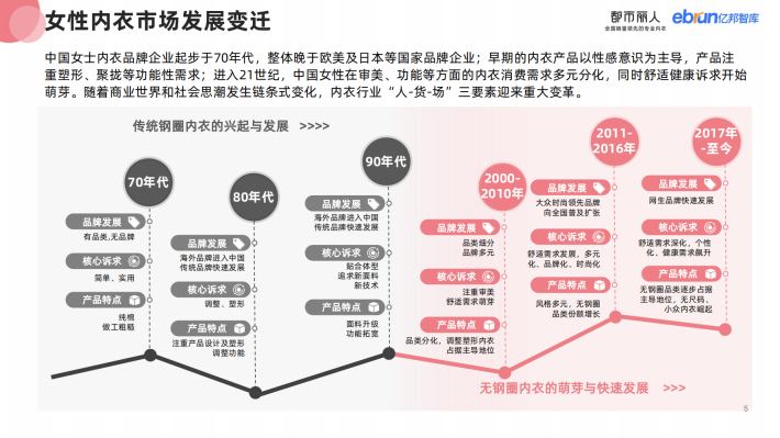 中国女士内衣品牌企业起步于70年代,整体晚于欧美及日本等国家品牌企业;早期的内衣产品以性感意识为主导,产品注重塑形、聚拢等功能性需求;进入21世纪,中国女性在审美、功能等方面的内衣消费需求多元分化,同时舒适健康诉求开始萌芽。随着商业世界和社会思潮发生链条式变化,内衣行业“人-货-场”三要素迎来重大变革。