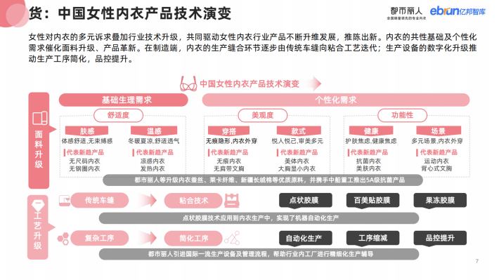 女性对内衣的多元诉求叠加行业技术升级,共同驱动女性内衣行业产品不断升维发展,推陈出新。内衣的共性基础及个性化需求催化面料升级、产品革新。在制造端,内衣的生产缝合环节逐步由传统车缝向粘合工艺迭代;生产设备的数字化升级推动生产工序简化,品控提升。
